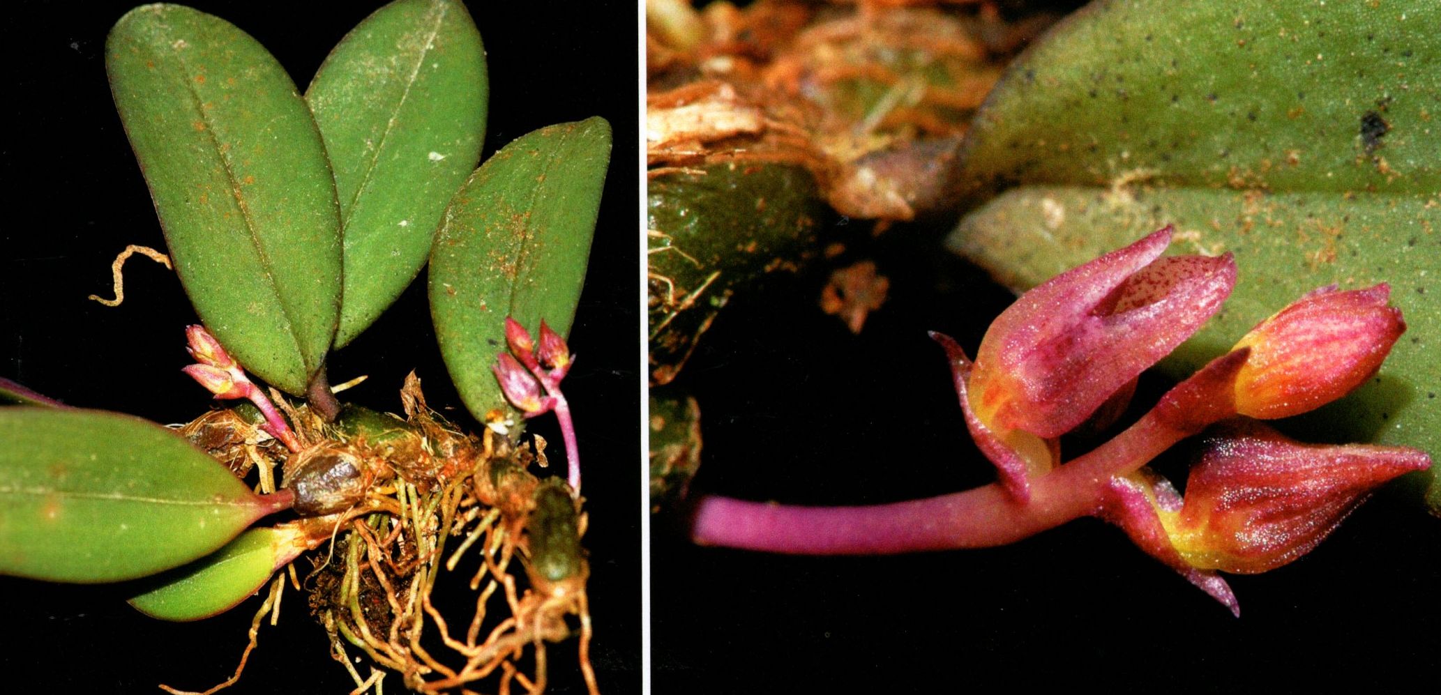 Found in penninsular Malaysia in fairly exposed montane forests at elevations around 1500 meters as a mini-miniature sized, cool growing epiphyte with a creeping rhizome with .18" [4.5 mm] between each ovoid, purple in youth, green in maturity pseudobulbs carrying a single, apical, erect, elliptic, obtuse, green above, purple with a green midvein becoming green with age below, petiolate base leaf that blooms in the spring on a pendulous, peduncle to .4" [1 cm] long, provided with 2 scales, rachis to .28" [7 mm] long, loosely 6 flowered inflorescence with triangular, acute, longer than the ovary floral bracts.