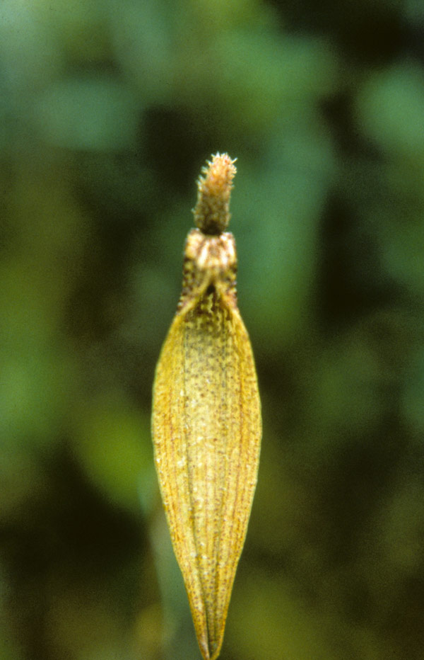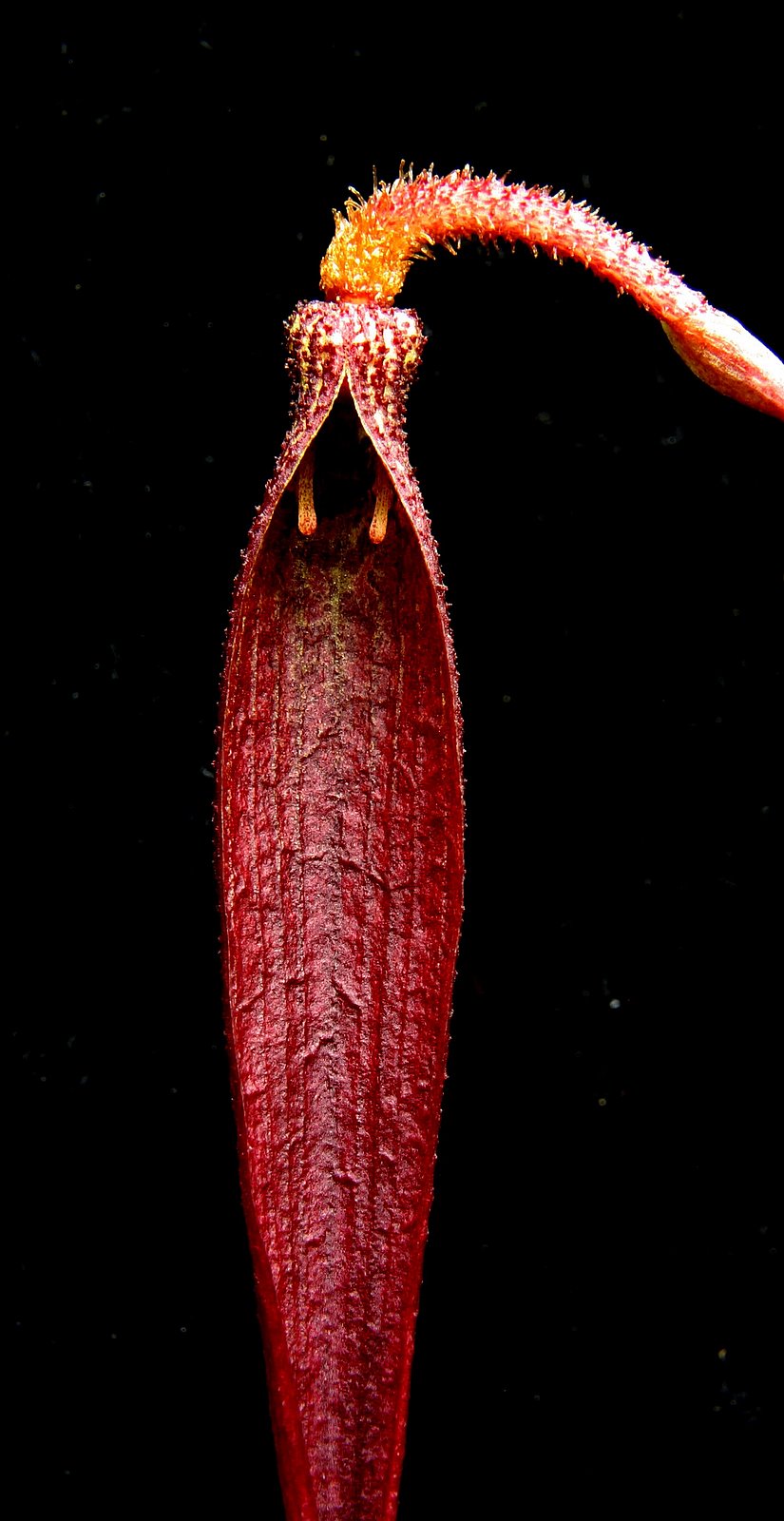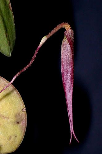 Found in New Guinea on trees in forests at elevations around 800 meters as a large sized, warm growing epiphyte with an elongate rhizome giving rise to ascending almost parellel to the rhizome, cylindrical pseduobulbs carrying a single, apical, erect, ovate to suborbicular leaf that blooms in the winter on an erect, thin, basal, sparsely muricate, 2.8 to 4" [7 to 10 cm] long, single flowered inflorescence carrying a nodding flower