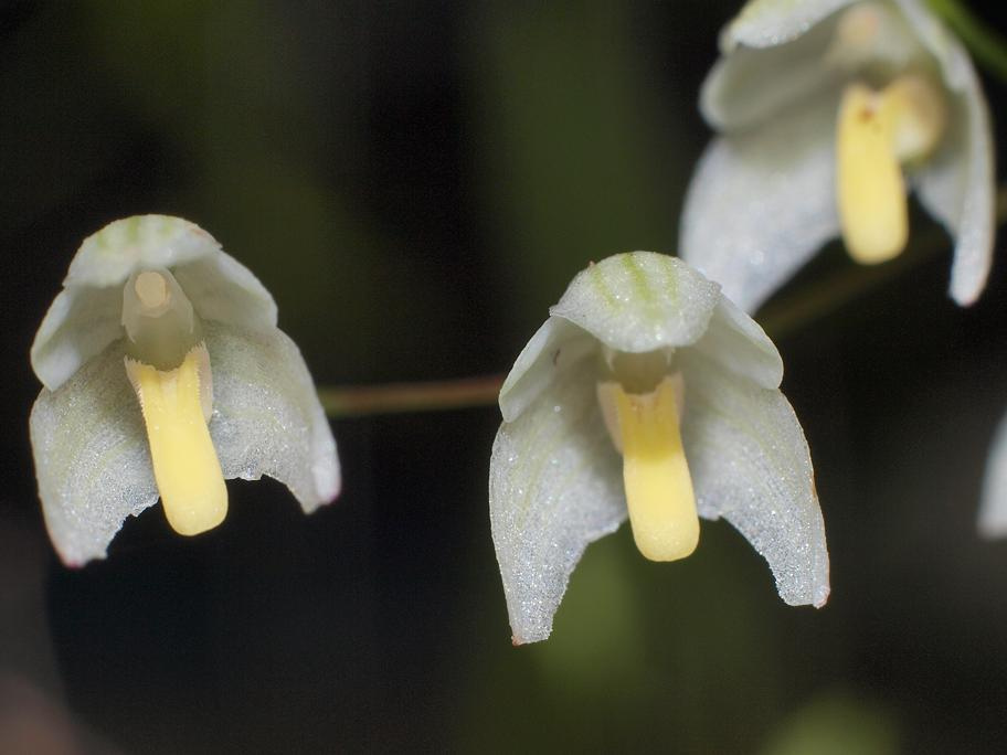 Found in Queensland Australia in rain or cloud forest at elevations of 600 to 1200 meters as mini-miniature sized, warm to cool growing epiphyte or lithophyte with a much branching rhizome with .32 to .6" [.8 to 1.5 cm] between each grooved to ribbed, nearly orbicular to ovoid pseudobulbs carrying a single, apical, erect, coriaceous, dark green, narrowly oblong to linear, acute, shortly petiolate base leaf that blooms in the spring on a basal, wiry, longer than the leaf, 2" [5 cm] long, 1 to 8 flowered inflorescence.