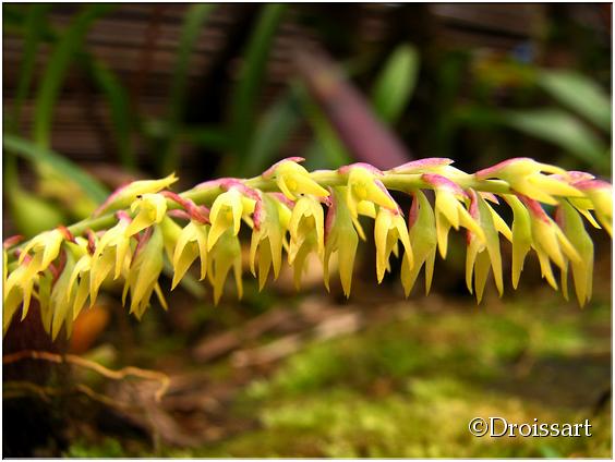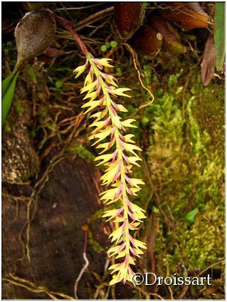 Found in Sierra Leone, Ghana, Ivory Coast, Liberia, Nigeria, Gulf of Guinea Islands Gabon and Zaire in lowland and montane forests at elevations of sea level to 1200 meters as a small sized, hot to warm growing epiphyte with to 1" between each, ovoid to narrowly ovoid, slightly flattened, obtusely 3 to 4 angled pseudobulbs carrying a single, apical, erect, coriaceous, thick, narrowly linear-lanceolate, to linear, acute to subacute, gradually narrowing into the petiolate base leaf that blooms in the fall on a basal, erect to patent, glabrous, 2.8 to 9" [7 to 22 cm] long, terete, densely many flowered inflorescence