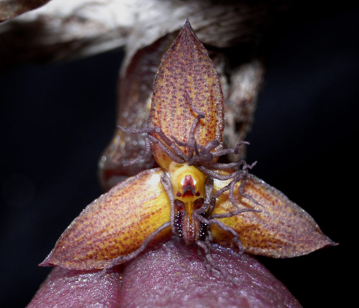 Found in penninsular Malaysia on mossy tree trunks at elevations around 1000 meters as a mini-miniature sized, warm to cool growing epiphyte with a pendulous, branching rhizome with .4 to 1" [1 to 2.5 cm] between each ovoid, orange in youth, maroon later pseudobulb carrying a single, apical, erect, thick, stiff, ovate to elliptic, acute, maroon in youth, maroon suffused with dark green with age leaf that blooms in the later summer and fall on an erect, .24 to .32" [6 to 7 mm] long, single flowered inflorescence enveloped by sheaths and with a tubular, acute floral bract and carrying ephemeral flowers.