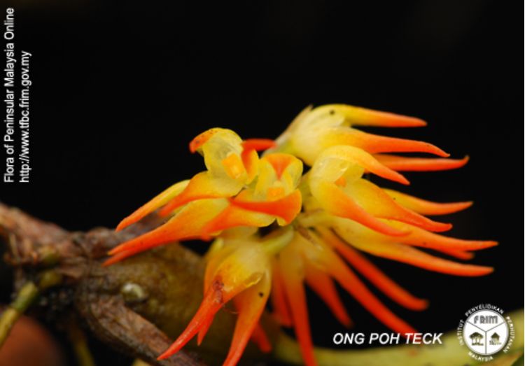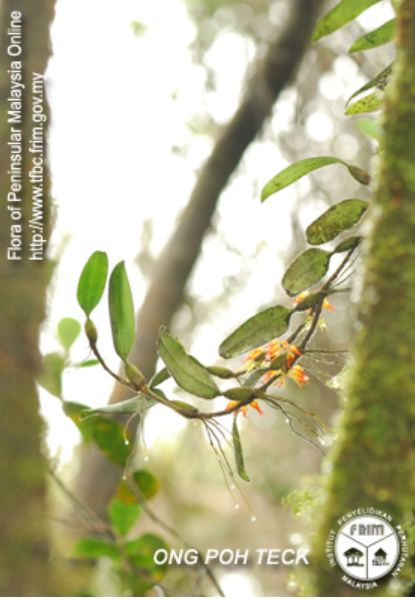 Found in Malaysia, Borneo, Java and Sumatra in lower montane forests at elevations of 700 to 2200 meters as a miniature sized, pendulous to scrambling, warm to cool growing epiphyte with .4 to .8" [1 to 2 cm] between each tilted at an acute angle to the rhizome, ovoid to cylindrical, variable sized pseudobulbs carrying a single, apical, narrowly oblong, obtuse, sessile leaf that blooms in the winter on an arising from the rhizome, 2 to 3 flowered .2 to .4" [6 to 9 mm] long inflorescence.