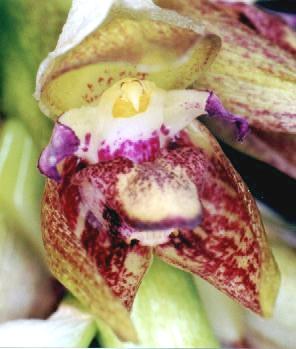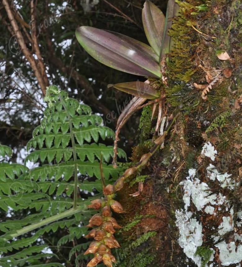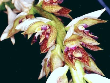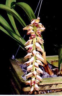 Found in Madagascar in humid, mossy evergreen forests at elevations of 600 to 2000 meters on dead trees as a large sized, warm to cool growing epiphyte requiring shade and high humidity and have close-set, orbicular to widely oval, compressed pseudobulbs carrying 2 to 3 oblanceolate, persistent leaves that blooms on a 12 to 16" [30 to 40 cm] long, sheathed, inflorescence that carries many [20] large, colorful flowers enveloped by light colored floral bracts occuring in the summer and fall in nature. Best grown on a treefern mount or cork slabs with sphagnun pads, given regular waterings, high humidity and light shade.
