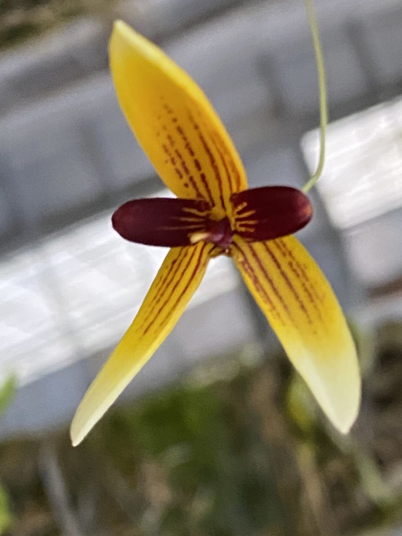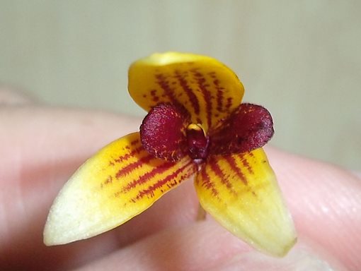 Found in the Philippines on the east coast of Luzon at elevations around 600 meters as a warm growing epiphyte or lithophyte with .4 to 1.6" between each pyriform, tetragonal to globose psedobulbs carrying a single, apical, porrect to erect, oblong to oblanceolate, green to light brown leaves that blooms from the rhizome or basally on a very, thin, wiry, longer than the leaves, to 3" [7.5 cm] long, filamentous, single flowered inflorescence.
