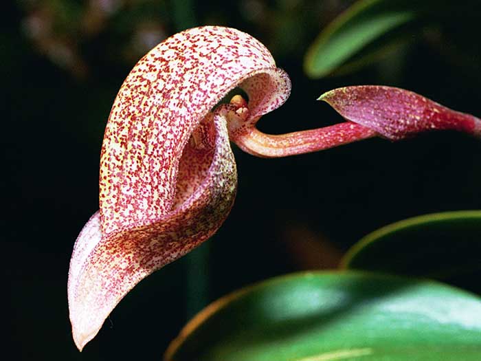 This epiphytic species is found in Papua and New Guinea and The Solomon Islands and blooms on a basal, single flowered inflorescence.