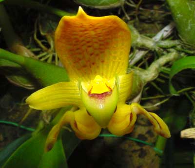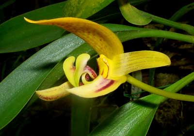 Found in Borneo, penninsular Malaysia and the Philippines in hill and lower montane forests at elevations of 700 to 1200 meters as a small sized, unifoliate epiphyte and occassional lithophtye in montane forests on bare trunks of large trees or in forests on limestone, with 2" [5 cm] egg-shaped pseudobulbs encased in bristles and held close together on the rhizome and a solitary, elliptic-oblong leaf, blooming in the summer and fall on a erect, 6 5/8" [17 cm] long, single flowered inflorescence carrying a long-lasting, heavy textured, slightly fragrant flower held near the leaf's end.