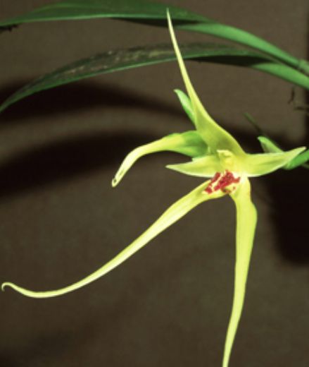 Found in New Guinea in lower range forests at elevations around 800 to 1350 meters as a medium sized, warm to cool growing epiphyte with a very short rhizome giving rise to ovoid pseudobulbs carrying a single, apical, erect, elliptic-ligulate, obtuse, petiolate base leaf that blooms in the early summer and again in the fall on an erect, terete, provided with a few distant peduncle-scales, 16” [40 cm] long, apically 2 to 3 flowered inflorescence with elliptic, cucullate, much shorter than the pedicellate ovary floral bracts.