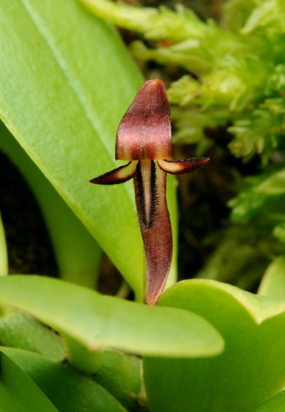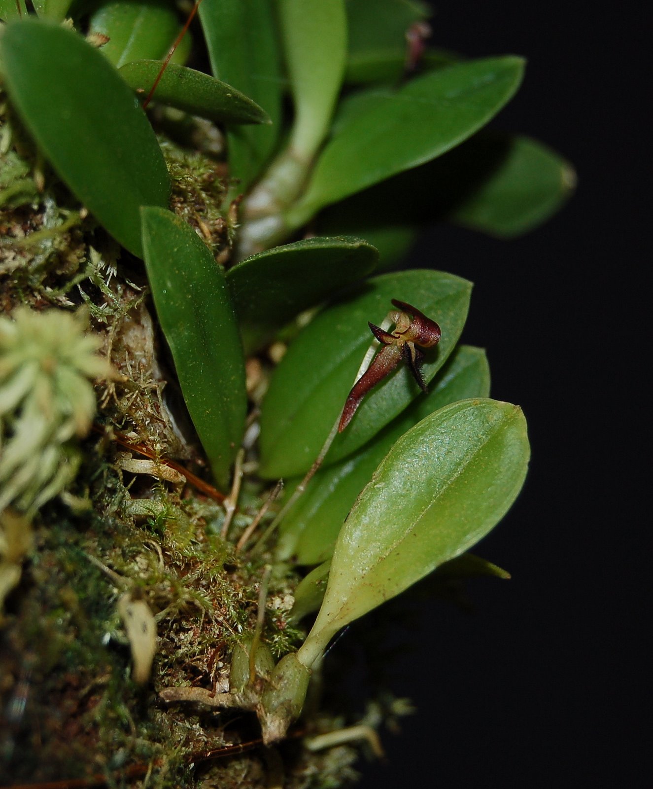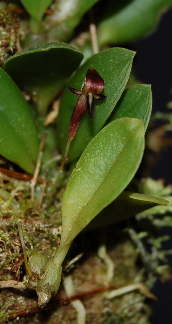 Found in Irian Jaya New Guinea in ridge-top primary forests at elevations around 600 meters as a mini-miniature sized, hot growing epiphyte with fairly close set, obliquely erect, ovoid pseudobulbs carrrying a single, apical, erect, coriaceous, elliptic to obovate, acute-acuminate, abruptly narrowing into the petiolate base leaf that blooms on a 1.2" [3 cm] long, erect, single flowered inflorescence with tubular, acuminate, slightly longer than the vary floral bract.