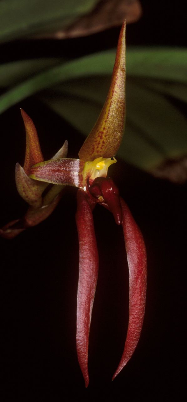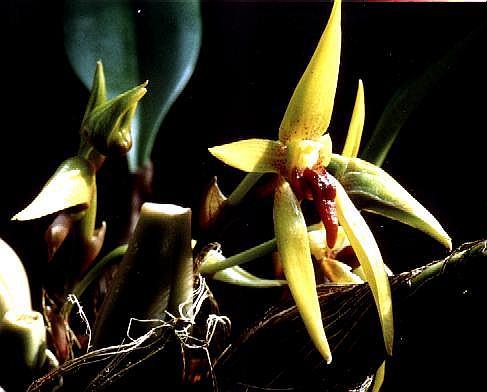 Found only in the Philippines at elevations around 500 meters as a small sized, unifoliate epiphyte with close set, pear-shaped, erect to ascending pseudobulbs carrying a single, apical, leathery, oblong, gradually narrowing below into the rigid petiolate base leaf which blooms in the spring on a basal, ascending, 4" [10 cm] long, successively opening, 2 to 3 flowered inflorescence with color variable, stinky flowers, growing best in hot to warm temperatures, partial shade and growing in pots.