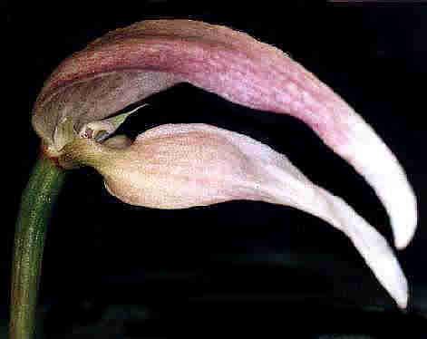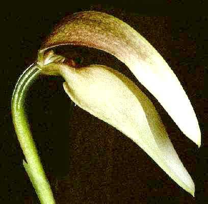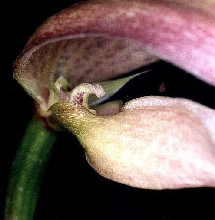 This species is from penninsular Malaysia, Sabah Borneo and Java in wet primary forests at elevations of 300 to 600 meters as a small sized, hot to warm growing epiphyte with .6" [1.5 cm] between each distinct, ovoid, obtusely 4 angled pseudobulb carryijng a single apical, erect, elliptic to obovate, rounded to obtuse, narrowing below into the petiolate base leaf that blooms on a longer than the leaf, 6 to 8" [15 to 20 cm] long, basal, slender, single flowered inflorescence, with triangular, tubular sheaths that turn brown with age, and holds the flower above the leaves.