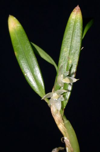 Found in the Moluccas, New Guinea and the Solomon Islands on trees in forests at elevations around 1000 meters as a miniature sized, warm growing epiphyte with cylindical-conic, subparellel to the rhizome pseudobulb carrying a single, apical, erect, elliptic-ligulate, apiculate, cuneate below into the base leaf that blooms in the fall and winter on an erect, .2 to .35" [5 to 9 mm] long, laxly 1 to 2 flowered inflorescence