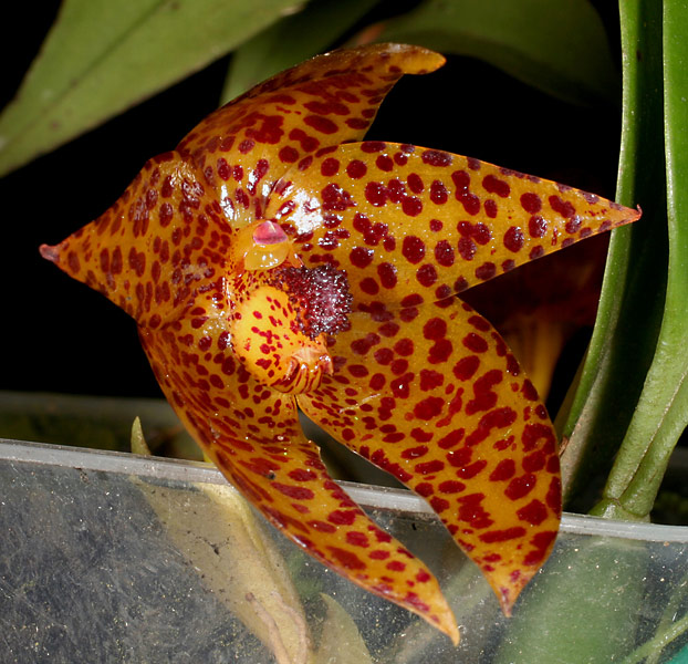 Found in Penninsular Malaysia, Borneo, Sulawesi and the Philippines in primary forests at elevations of 100 to 1300 meters as a small sized, hot to warm growing epiphyte with .2 to .58” [.05 to 1.4 cm] between each ovoid to almost cylindrical pseudobulb carrying a single, apical, elliptic to obovate, acuminate, gradually narrowing below into the shortly petiolate base leaf that blooms in the winter on a basal, 2 to 2.6” [5 to 6.5 cm] long, single flowered inflorescence