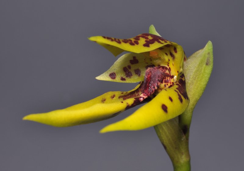 Found in New Guinea in lower montane forests on tall trees at elevations around 200 to 1800 meters as a medium sized, hot to coolgrowing epiphyte with ovoid, grey-green pseudobulbs carrying a single, apical, erect, elliptic-ligulate, subacute, gradually narrowing below into the short attenuate petiolate base leaf that blooms in the winter on an erect, laxly 3 to 7, successively flowered, 18" [45 cm] long inflorescence with elliptic, less than half as long as the pedicellate ovary floral bracts.