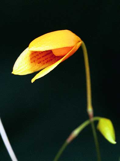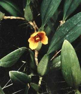 Found in the Philippines at elevations of 1500 to 2000 meters as a miniature sized, cool growing epiphyte with to 1.6" [to 4 cm] between each, ovoid to tetragonal pseudobulb carrying a single, apical, erect to suberect, leathery, ovate to narrowly oblong, obtuse, subpetiolate base leaf that blooms at most any time of the year on an erect, basal, 1.6 to 3.6" [4 to 9 cm] long, filiform, slightly longer than the leaf, single flowered inflorescence carrying resupinate flower that opens each morning and closes each night and lasts for about 10 days.