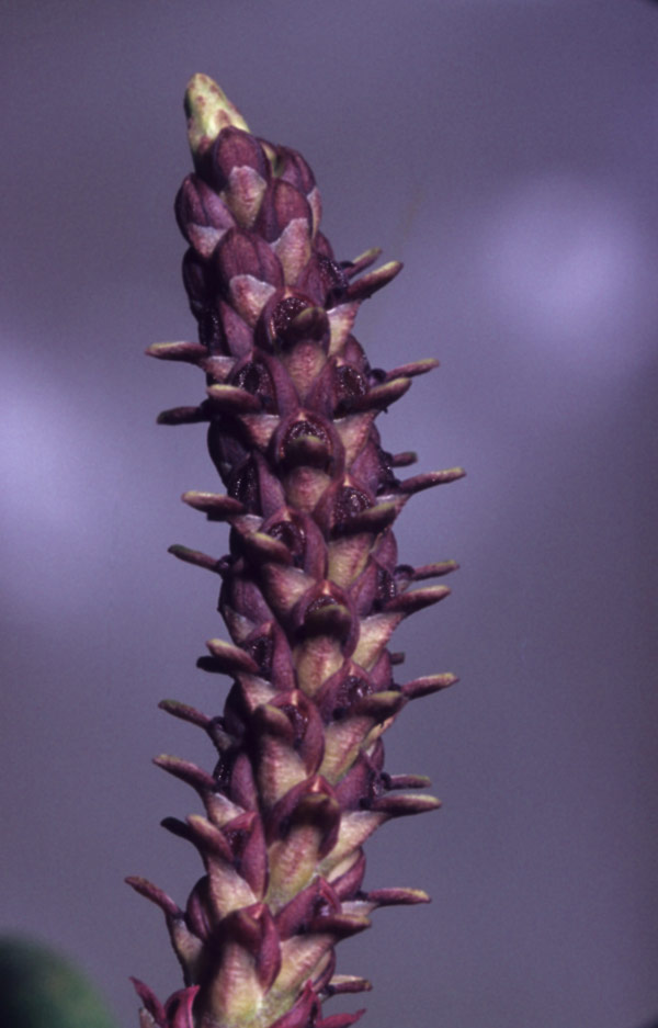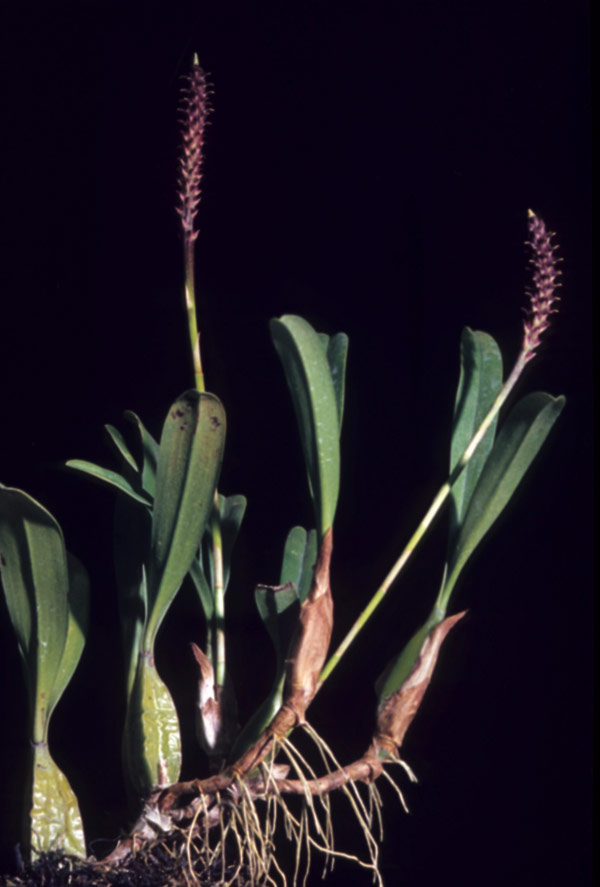 Found in east northeastern Madagascar in humid, evergreen forests on plateau at elevations around 900 to 1400 meters as a miniature to small sized, warm to cool growing epiphyte with subcylindrical, 4 angled, yellow pseudobulbs carrying 2, apical, lanceolate leaves that blooms in the spring and summer on an erect, rachis 4.8 to 6" [12 to 15 cm] long, thickened, dull red, 20" [50 cm] long overall, densely many flowered inflorescence.