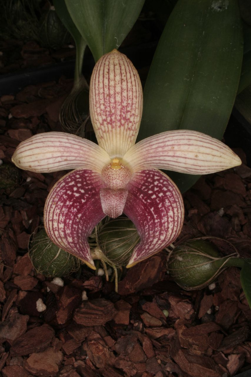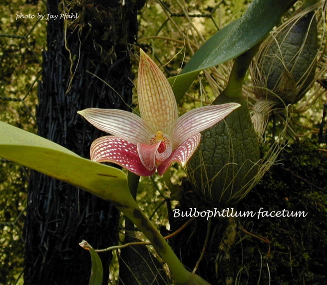Endemic to the Philippines in the mountanous region of Luzon at elevations of 1200 meters growing as an epiphyte on tree trunks in shady locations or the rocks below them with well spaced [2"] ovoid, pseudobulbs with persistent basal bristles carrying a single, apical, oblong to elliptic, leathery petiolate leaf that blooms on an erect, 2 3/8" [6 cm] long, basal, single bracted inflorescence carrying a single flower that opens in the morning and closes by early afternoon only to reopen the next day.