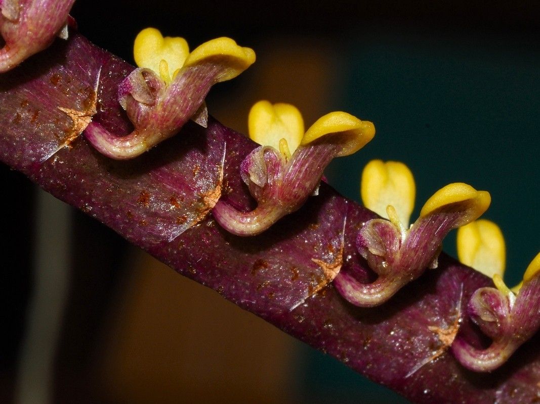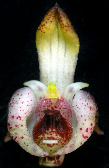 The rachis is slightly longer to 11" + [28 cm long], petals ovate, not thickened towards the apex, with successive, few at a time, yellow to white flowers with red-purple spots