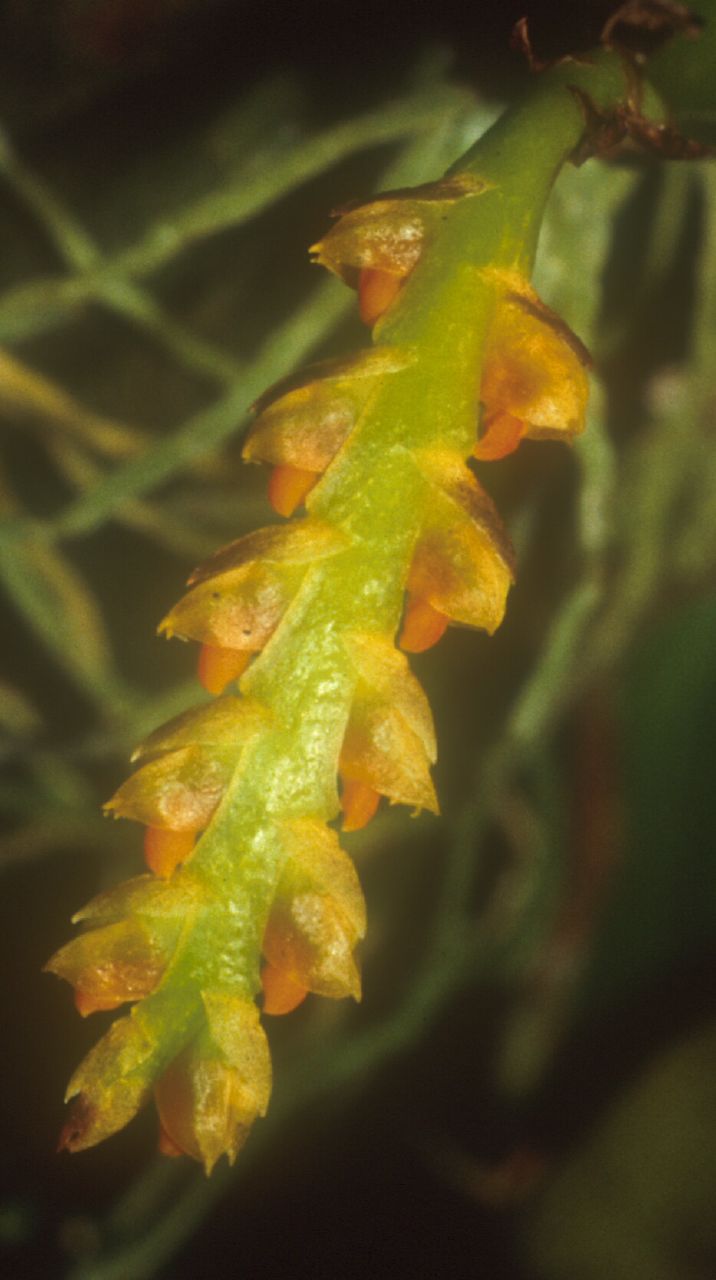 Found in Ghana, Guinea, Ivory Coast, Liberia, Nigeria, Sierra Leone, Central African Republic, Cameroons, Equatorial Guinea, Gabon, The Gulf Of Guinea Islands, Rwanda, Zaire, Tanzania, Uganada, Angola, Zambia and Malawi in woodland, lowland, submontane and montane forests at elevations of 650 to 2300 meters as a miniature sized, hot to cool growing epiphyte and occasional lithophyte with with 1/4 to 1.6" [.7 to 4 cm] between each ovoid to ellipsoid, often obscurely 4 angled, light green pseudobulbs carrying 2 apical, elliptic, pale green, stiff, coriaceous leaves that blooms winter and spring on an erect, 3.2 to 4" [8 to 10 cm] long, widening towards the apex, 10 to many flowered inflorescence with the flowers appearing out of the rachis much more than in B fuscum.