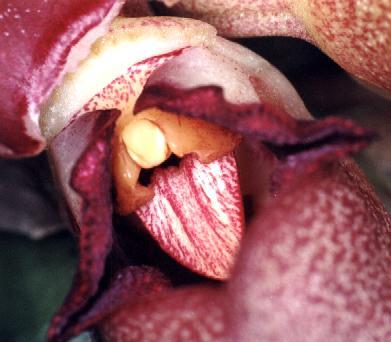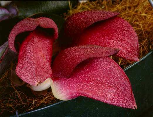 Found in Papua New Guinea on cliffs in full sun, without locality as a large sized, warm to cool, pendent growing epiphyte or lithophyte on cliffs with out plant details but said to be similar to B phalaenopsis that blooms on a basal, to 4" [10 cm] long, to 3 flowered inflorescence with bracts on the peduncle and a circular, apically acuminate floral bract and carrying simultaneously, barely opening flowers that smell of rotting meat.