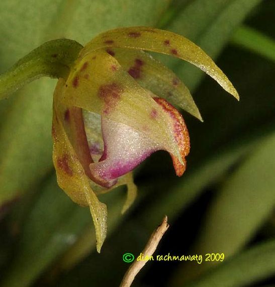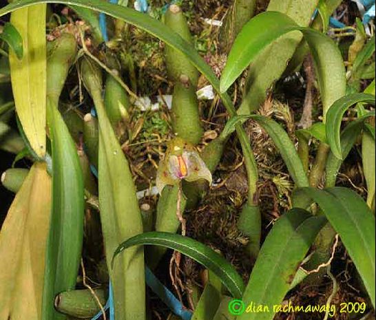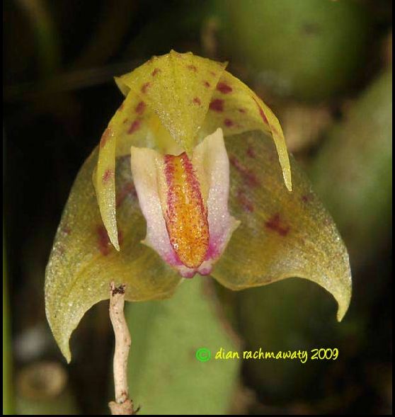 Found in Borneo on ridges in montane forests at elevations up to 1300 meters as a hot to cool growing epiphyte with a creeping rhizome with .36 to .48" [.9 to 1.2 cm] between each distinct, ovoid, slightly flattened pseudobulbs and carrying a single apical, erect, rather thin, elliptic, acute, gradually narrowing below into the petiolate base leaf that blooms in the fall on a basal, 1.4 to 1.8" [3.5 to 4.5 cm] long, single flowered inflorescence with tubular floral bracts