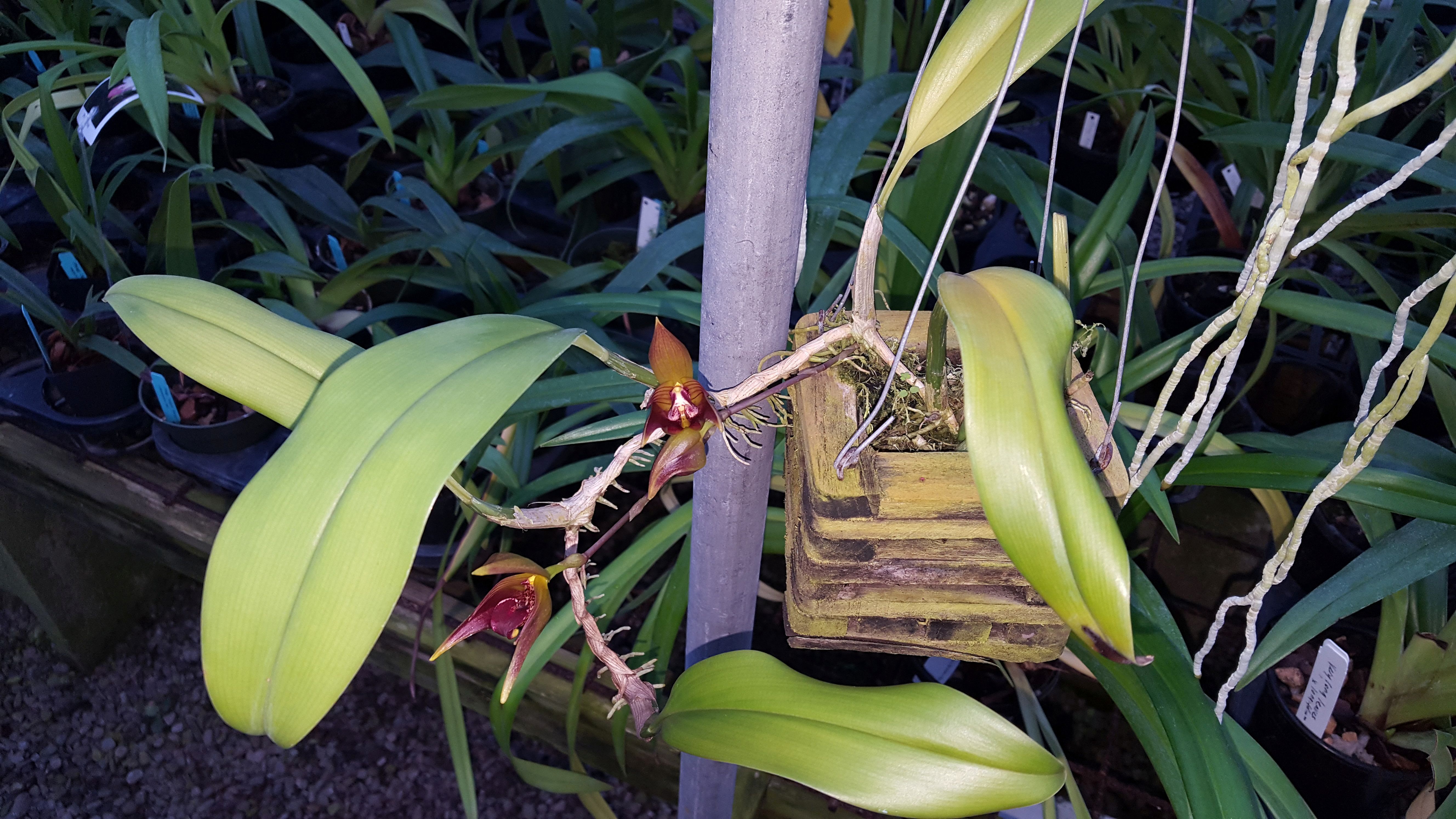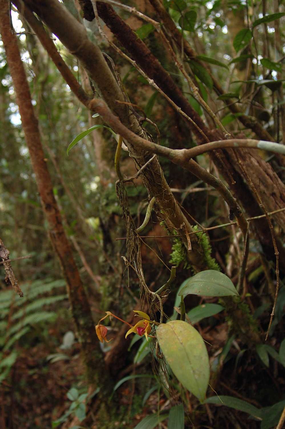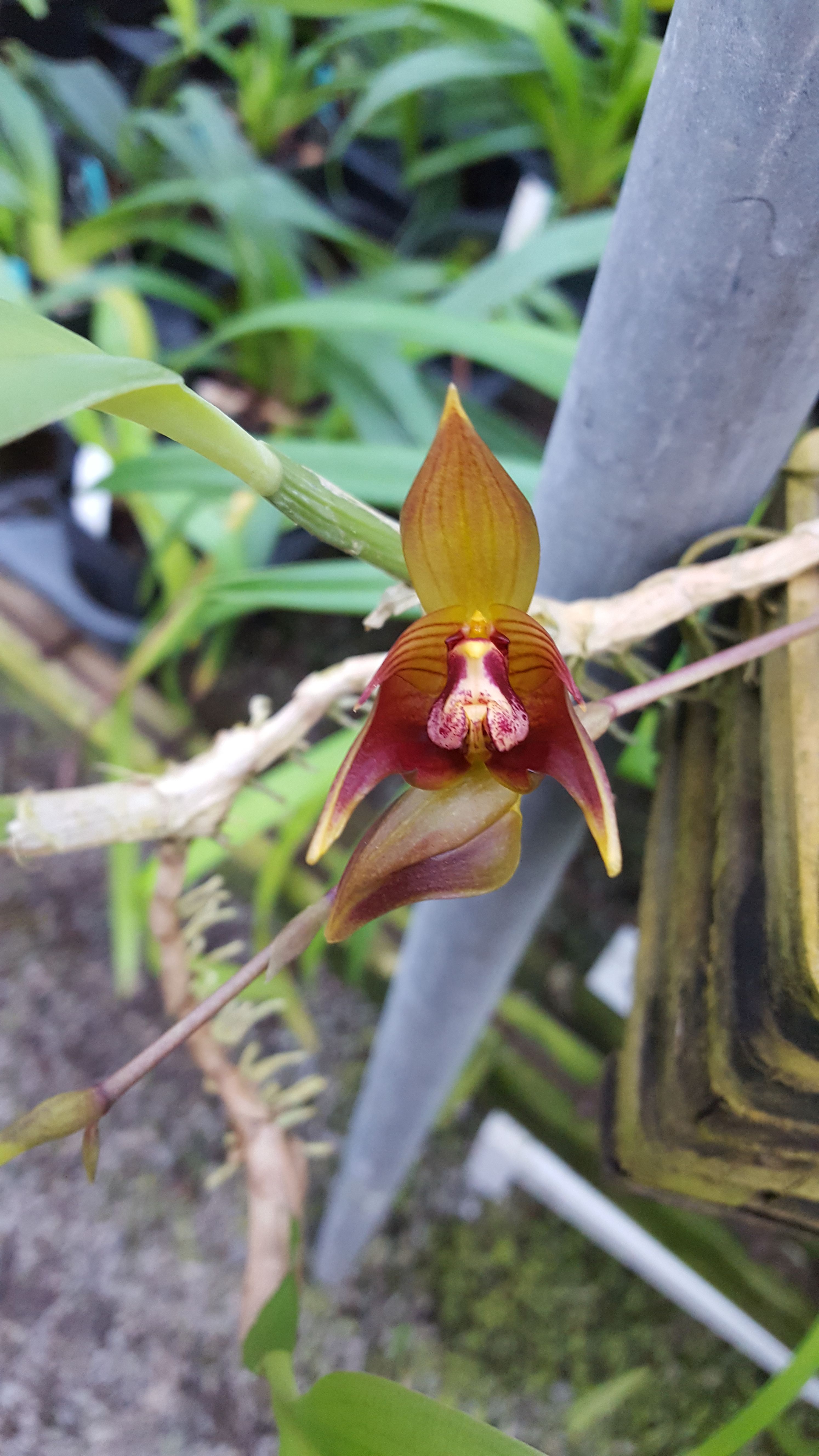 Found in Sumatra, Java, Borneo and the Philippines in hill and lower montane forests or dense riverine forests at elevations of 600 to 1800 meters as a small to medium sized, hot growing, unifoliate epiphyte and ocassional terrestrial with a creeping rhizome giving rise to distinct, .8 to 8" [2 to 20 cm] between each, slender, erect, terete and slightly flattened, cylindrical pseudobulbs carrying a single, apical, oblong, elliptic to obovate, leathery, acute to acuminate, petiolate base leaf that blooms in the spring and summer on an erect to patent, 5" [12.5 cm] long inflorescence with conspicuous sheaths, giving rise to a single [if more than one then you probably have what was known as B sociale], foul smelling - sometimes pleasant, fleshy, flowers that do not open fully.