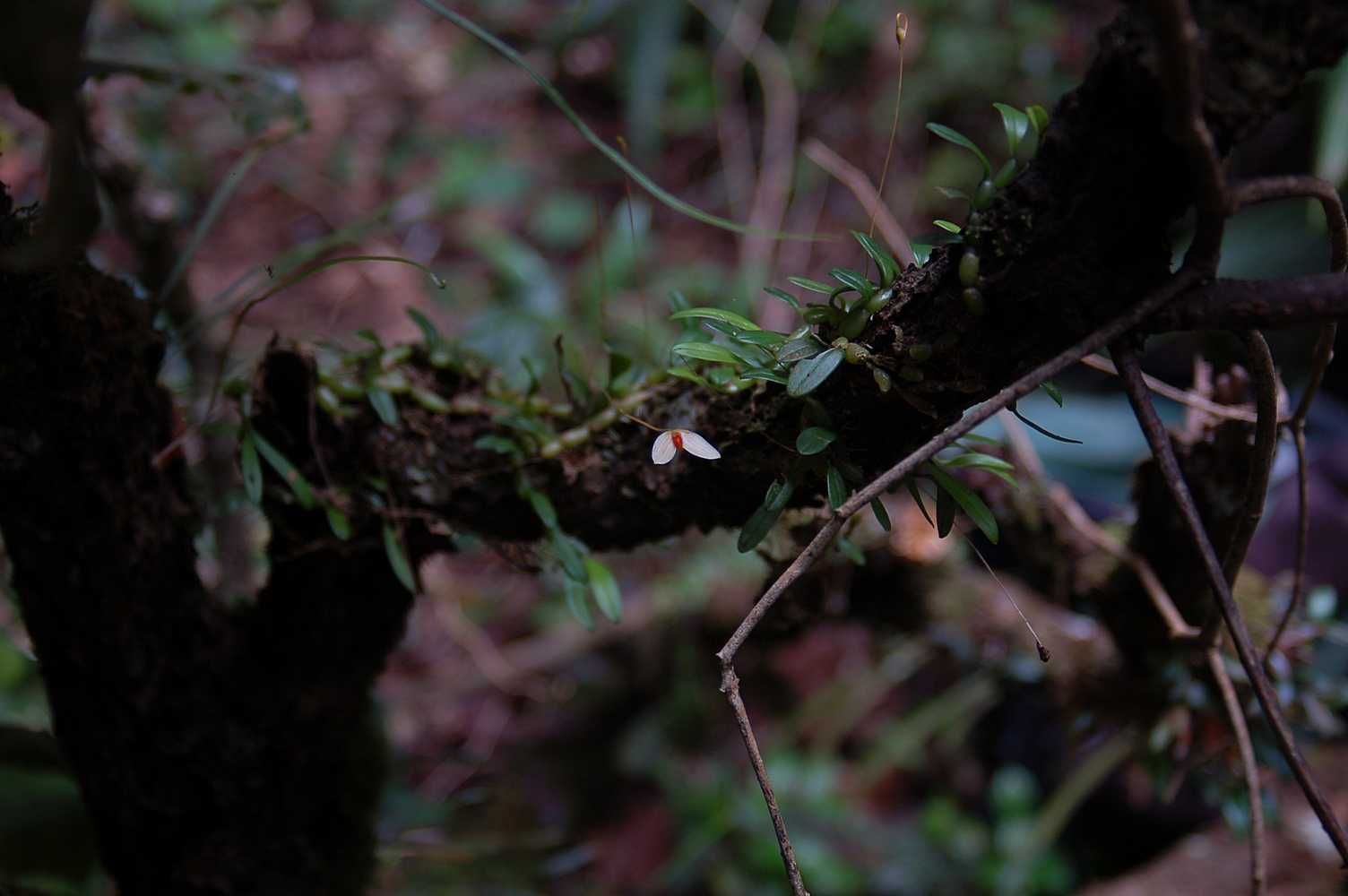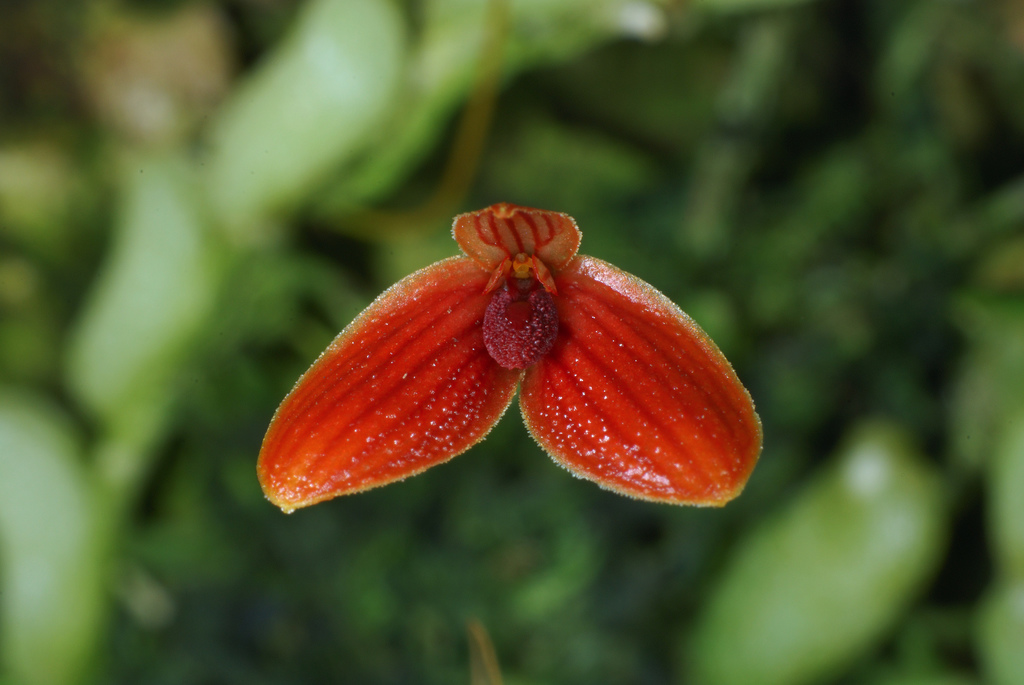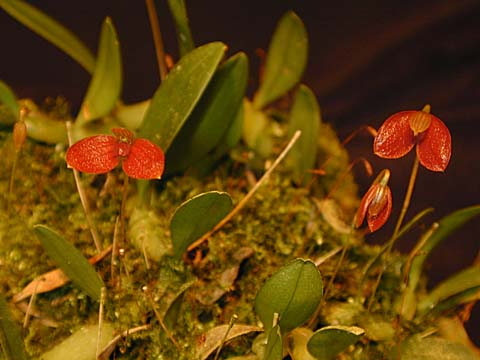 Found in the Chinese Himalayas, Thailand, Malaysia, Sumatra, Java, Borneo, lesser Sunda Islands and Sulawesi in montane forests at elevations of 900 to 2500 meters as a miniature sized, cold to warm growing epiphyte with a creeping, many branched, mat forming rhizome giving rise to close set, chain-like, oblong, ovoid to globose, somewhat laterally flattened, nearly prostrate to oblique pseudobulbs carrying a single, apical, thinly leathery, oval, oblong to elliptic, obtuse, petiolate base leaf that blooms in spring through fall on a 1 1/2" to 2 1/2"[3.75 to 6 cm] long, single flowered inflorescence holding the flower above the leaf