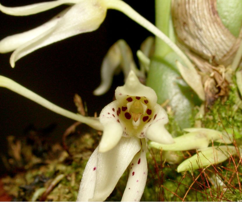 Found in western New Guinea in lower primary forests at elevations around 400 to 500 meters as a small sized, warm growing epiphyte with a rhizome without persistent scales, giving rise to distinct, .64" [1.6 cm] between each, erect, ellipsoid to ovoid, with age wrinkling along numerous longitudinal grooves, rounded in section pseudobulbs carrying a single, apical, elliptic, acuminate, petiolate base leaf that blooms in the spring on a solitary to many in a fascicle, peduncle .48 to .6" [1.2 to 1.5 cm] long, provided with 3 to 4 scale leaves, 2.4" [6 cm] long overall, single flowered inflorescence with shorter than the pedicel floral bracts.