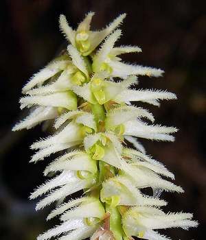 Found in Thailand around 1500 to 1600 meters in elevation as a mini-miniature sized, cool growing epiphyte with glossy, globular, dark green pseudobulbs enveloped basally by a few scarious sheaths and carrying 2 apical, dark green, acute, deciduous leaves that blooms in the winter often after the leaves fall on a basal, arching, 6 to 7.2" [15 to 18 cm] long, 20 to 25 flowered inflorescence with acute, longer than the ovary floral bracts.