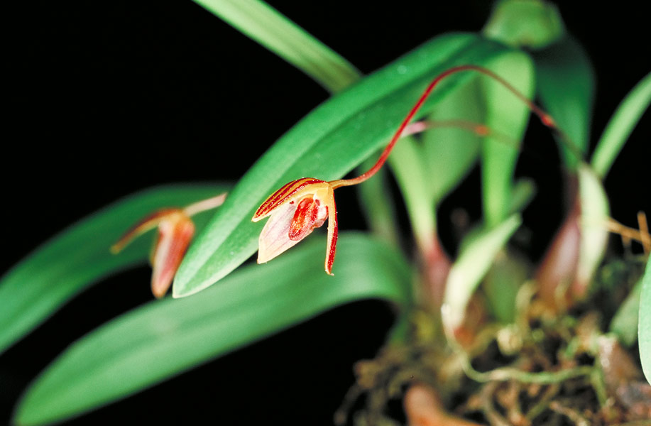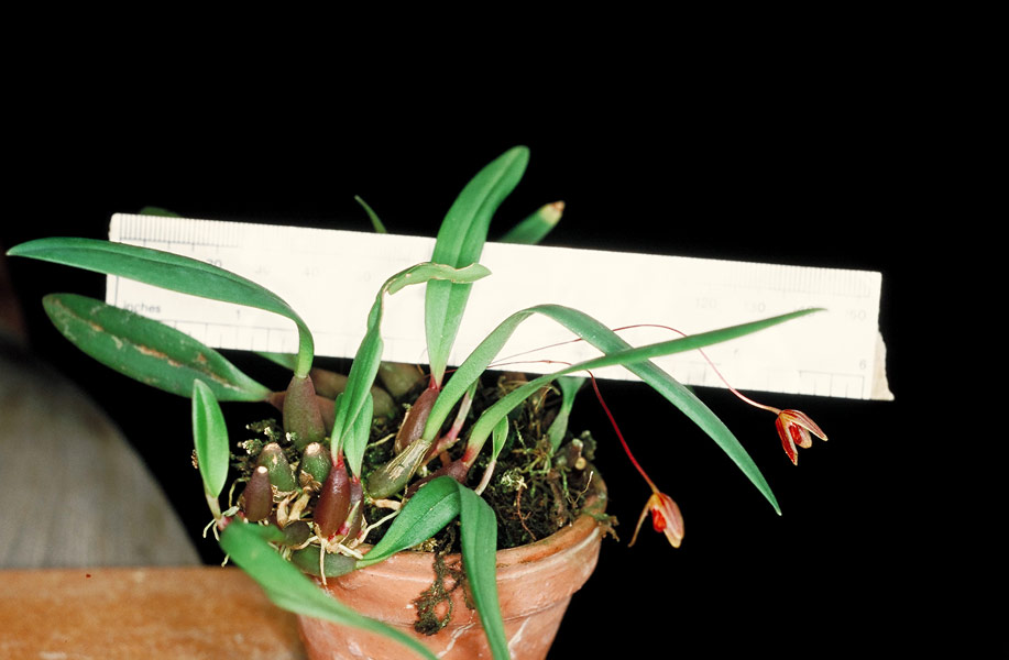 Found in penninsular Malaysia without elevational data as a mini-miniature sized, warm to cool growing epiphyte with.4" [1 cm] between each narrow, slightly decumbent basally, brownish green to brownish pseudobulb carrying a single, apical, erect, evenly elliptic to linear, obtuse, shortly petiolate base leaf that blooms on a basal, arching, thin, reddish, 2.8 to 3.2" [7 to 8 cm] long, single flowered inflorescence.