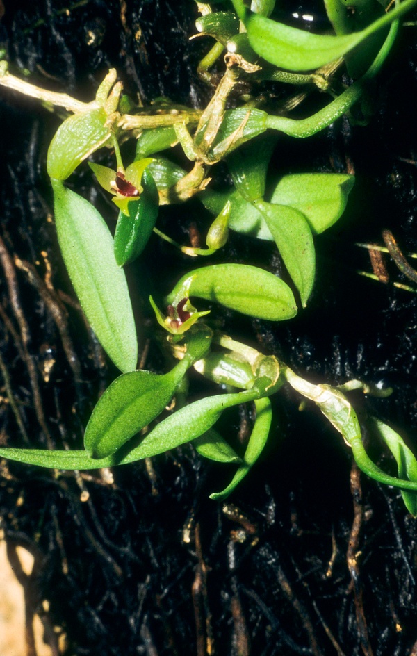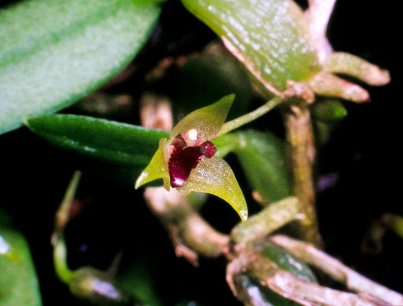 Found in Java and Sabah and Sarawak Borneo at elevations of 900 to 1500 meters as a mini-miniature sized, warm to cool growing epiphyte with .28 to 1” [.7 to 1 cm] between each obliquely ovoid pseudobulb carrying 2, apical, linear-lanceolate, apically cusped leaves that blooms in the winter on a basal, erect, .49 to .68" [1.2 to 1.7 cm] long, single flowered inflorescence.