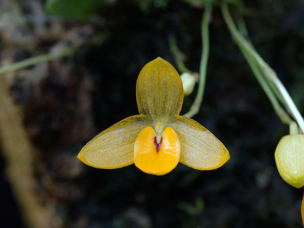 Found in Papua New Guinea in primary forests at elevations of 1600 to 2500 meters as a mini-miniature sized, cool growing epiphtye or terrestrial amongst grass in clay soils with a creeping, branching rhizome giving rise to clustered, ovoid-conical, not to slightly compressed, ribbed pseudobulbs carrying a single, apical, erect to suberect, rigid, leathery, glossy in youth, lighter beneath, elliptic, obtuse, gradually narrowing below into the petiolate base leaf that blooms in the winter and fall on a basal, erect, slender, bourne laterally, 2 to 3.6" [5 to 9 cm] long, single flowered inflorescence carrying flowers that close somewhat in the late afternoon to early evening and reopen in the morning and last about 1 week.