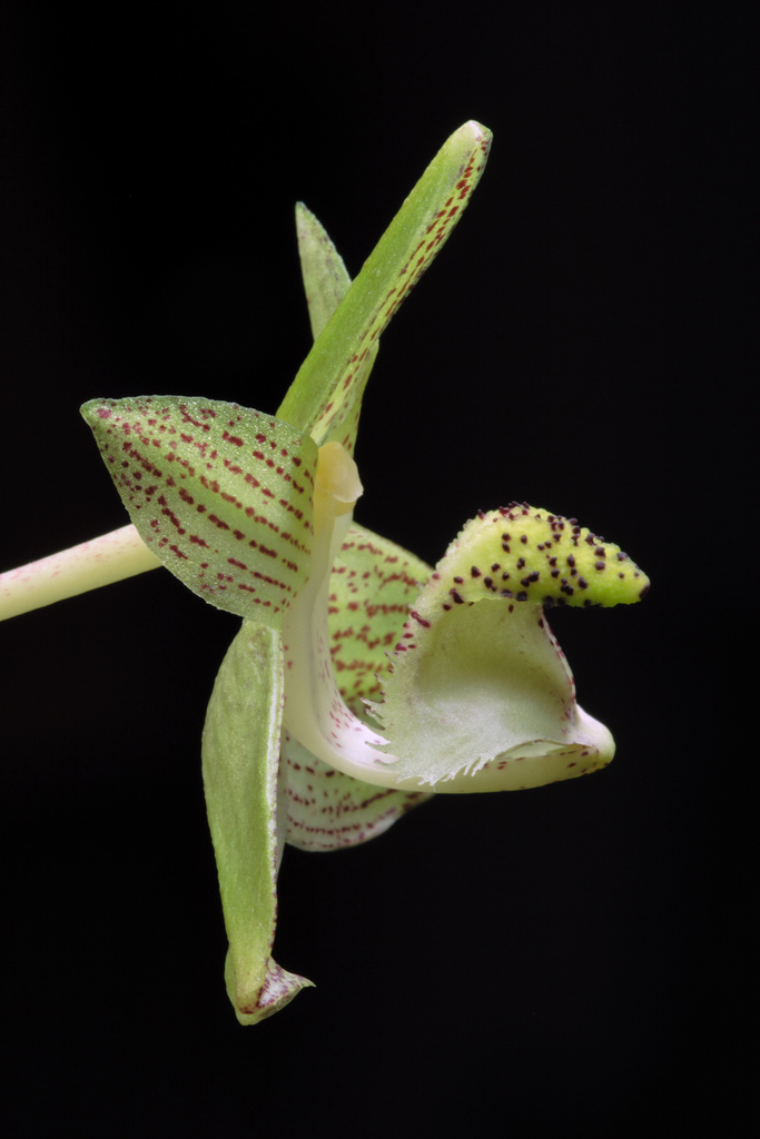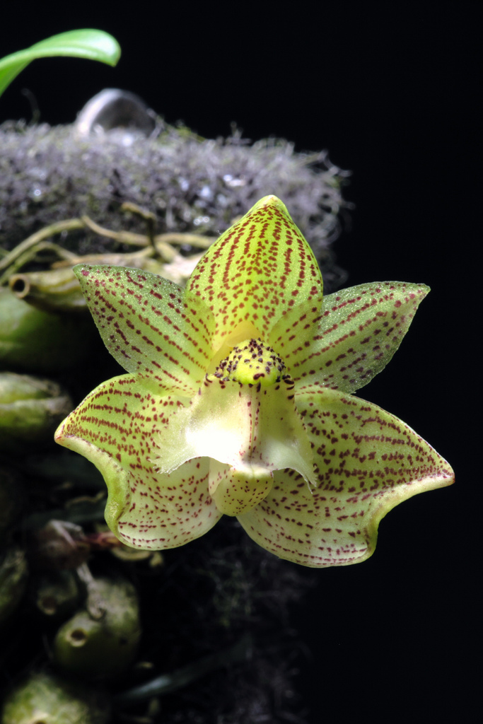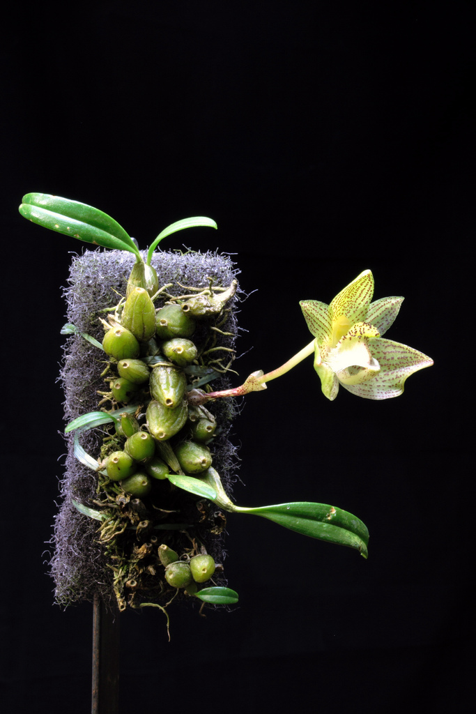 Found in southern China, Myanmar, Thailand, Vietnam, Cambodia, Laos, India and Taiwan on wooded slopes at elevations of 1000 to 2500 meters as a mini-miniature sized, hot to cool growing, unifoliate epiphyte with ovoid pseudobulbs carrying a single, apical, elliptic, petiolate below leaf that blooms in the later spring and summer on a stout, 2 3/8" [6 cm] long, single flowered inflorescence that arises at the base of a newly developed pseudobulb and holds the flower at leaf height.