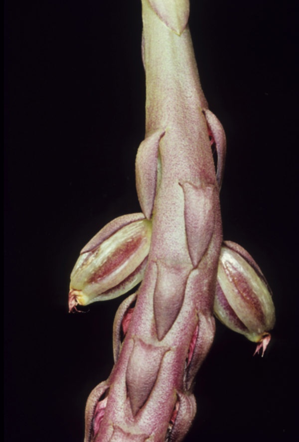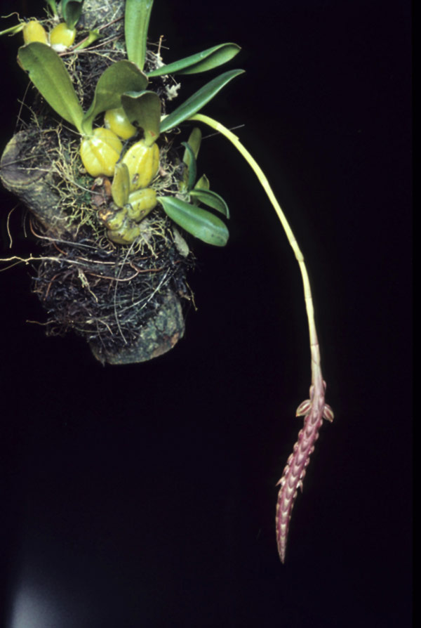 Found in Madagascar in humid eastern coastal forests at elevations of sea level to 100 meters as a miniature sized, hot growing epiphyte with ovoid, tetragonal, yellowish pseudobulbs carrying 2, narrowly oblong leaves that blooms in the spring on an erect, rigid, robust, peduncle to 8" [20 cm] long, with 6 to 7 adpressed reddish sheaths, rachis twice as thick, cylindrical, red brown, straight, to 4" [10 cm] long, densely many flowered inflorescence with obtuse, at least a third longer than the flower floral bracts.