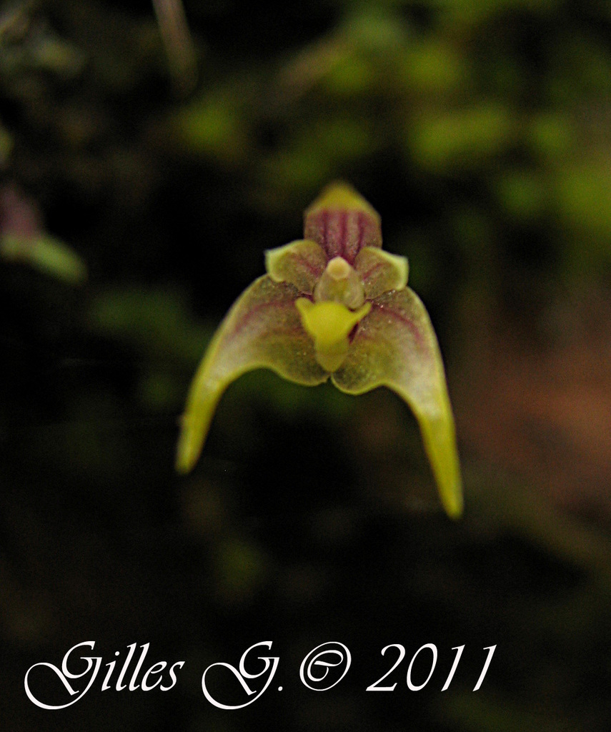 Found in southeastern Madagascar in humid evergreen forests at elevations around 600 meters as a mini-miniature sized, warm growing epiphyte with disc-like pseudobulbs carrying 2, apical, small leaves that blooms in the late summer and early fall on an erect, thread-like, single flowered inflorescence.