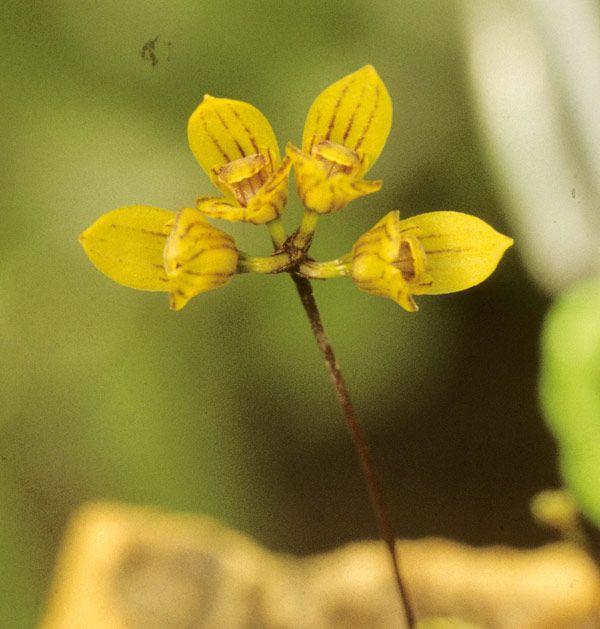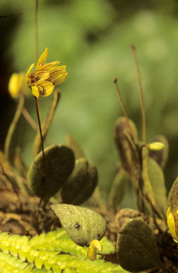 Found in Sri Lanka in submontane to tropical wet evergreen forests at elevations under 1400 meters as a mini-miniature sized, cool growing epiphyte with close-set, chain-like, horizontal elongated, pea shaped pseudobulbs basally encircled by evanescent sheaths leaving a ring of hairs and carrying a single, apical, lanceolate, obtuse, elongate, wiry, petiolate base leaf that blooms in the late summer through early fall on an erect, slender, 1 to 3" [2.5 to 7.5 cm] long, fasciles of 4 to 5 flowered inflorescence with broadly ovate, acute, single veined floral bracts and carrying greenish orange flowers with a red lip.