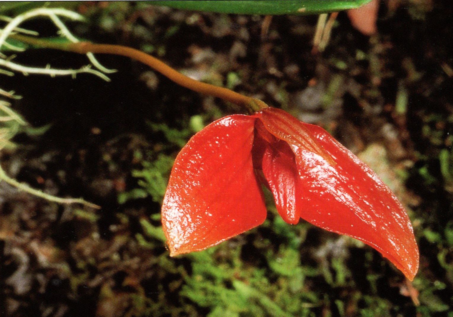Found in penninsular Malaysia, Sumatra in high and dry montane forests at elevations of 1400 to 2000 meters as a small sized, warm to cool growing epiphyte with a creeping rhizome with close set, ellipsoid, flattened, adpressed to the rhizome, chain-like pseudobulbs carrying a single, apical, erect, thick, ovate leaf that blooms in the spring on an erect, 1/4" [.6 cm] long, single flowered inflorescence with tubular floral bracts and carrying unscented flowers