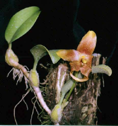 Found in the Philippines as a small sized, warm to cool growing epiphyte on tree trunks at elevations of 600 to 1300 meters with 2tp 2.4" [5 to 6 cm] between each tapered pseudobulb that carry a single, apical, oblong to elliptic, petiolate base leaf and blooms in the summer on an erect, basal, 3" [7.5 cm] long, single flowered inflorescence with three basal sheaths.