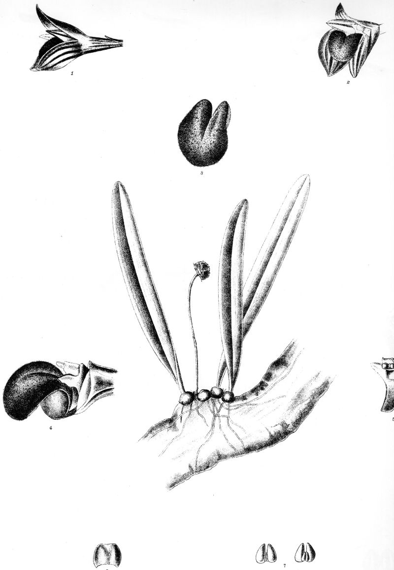 Found in Sikkim at elevations around 300 to 330 meters as a mini- miniature sized, hot growing epiphyte with chains of globose to depressed globose pseudobulbs carrying a single, apical, erect, fleshy, linear-oblong, shortly petiolate base leaf that blooms in the spring on an erect, basal, slender, shorter than the leaf, to 2.4" [6 cm] long, semi-globose capitulum.