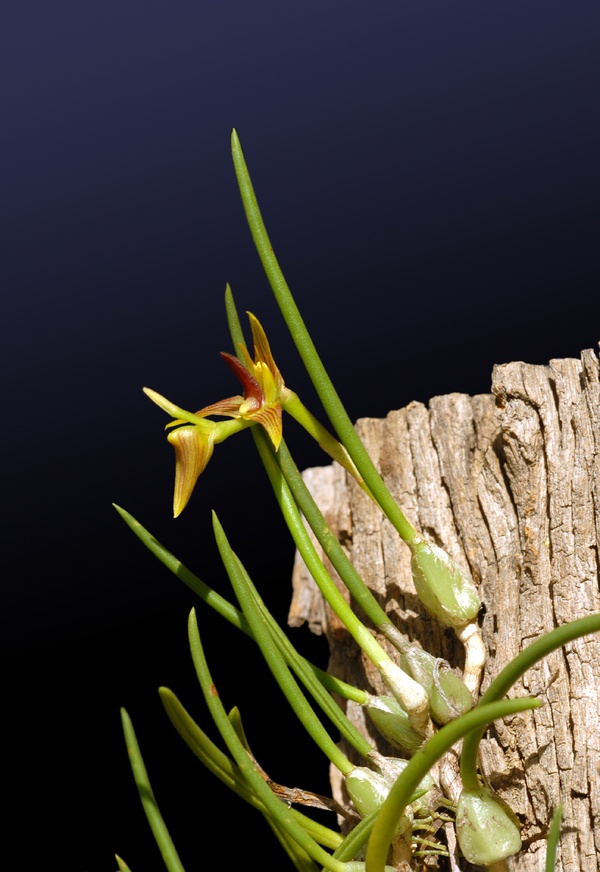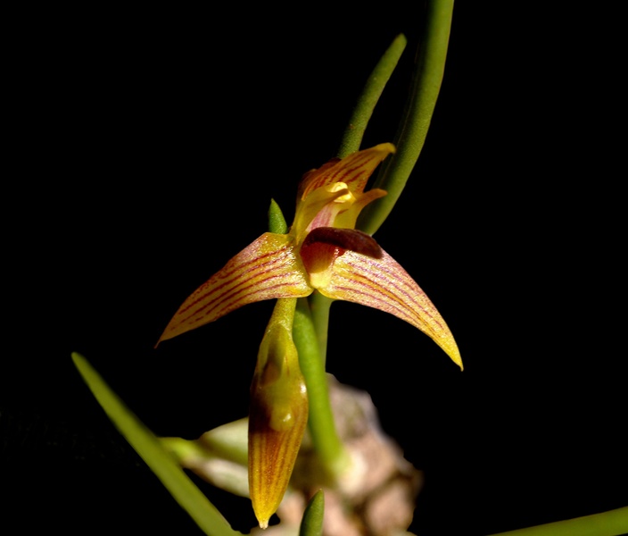 Found in Minas Gerais state of Brazil at elevations around 600 meters as a mini-miniature sized, warm growing epiphyte with a creeping rhizome giving rise to ovate-teragonal, green pseudobulbs enveloped by scarious sheaths and carrying a single, apical, green, terete, erect, rigid, attenuate and canaliculate below into the base leaf that blooms in the spring on a basal, erect, rigid, to 2” [5 cm] long, successively single, 2 flowered inflorescence with persistent, cream colored, triangular, acute, partially enveloping the dorsal sepal floral bracts and carrying patent, resupinate flowers.