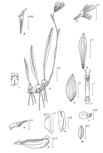 Found in Papua New Guinea at elevations around 3480 to 3930 meters as a mini-miniature sized, cold growing epiphyte or terrestrial with a long, creeping, branched, dirty white, glabrous rhizome giving rise to glabrous, rather apart, at right angle to rhizome, mainly globose, sometimes ellipsoid, truncate at tip and slightly sunken in pseudobulbs provided with at the base with 1 to 3 glabrous, ovate, acute bracts and carrying a single erect, coriaceous, glabrous, but margins papillate near tip only, lanceolate, lanceolate-spathulate, rarely ovate-lanceolate, acute, midrib grooved above, stoutly prominent below, lateral nerves up to 13, visible on underside only, margins subrevolute, thin petiolate-like base leaf that blooms in the winter on a solitary, peduncle glabrous, up to 3.8" [9.5 cm] high, at base with a tubular, glabrous obliquely truncate, acute, along its entire length with 2 similar bract, single flowered inflorescence with more infundibuliform than, but of the same length as the lower bracts, floral bract and carrying pale brown to yellowish flowers with purple spots of longitudinal straks and purple brown lateral petals.