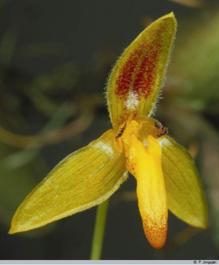 Found in New Guinea on trees in range forests at elevations around 800 meters as a small sized, warm growing epiphyte with a cauliform, glabrous rhizome giving rise to close set, subcylindrical, parellel to the rhizome pseudobulbs carrying a single, apical, erect, linear-ligulate, acute leaf that blooms in the late winter and early spring on an erect, filiform, to 2" [5 cm] long, single flowered inflorescence.