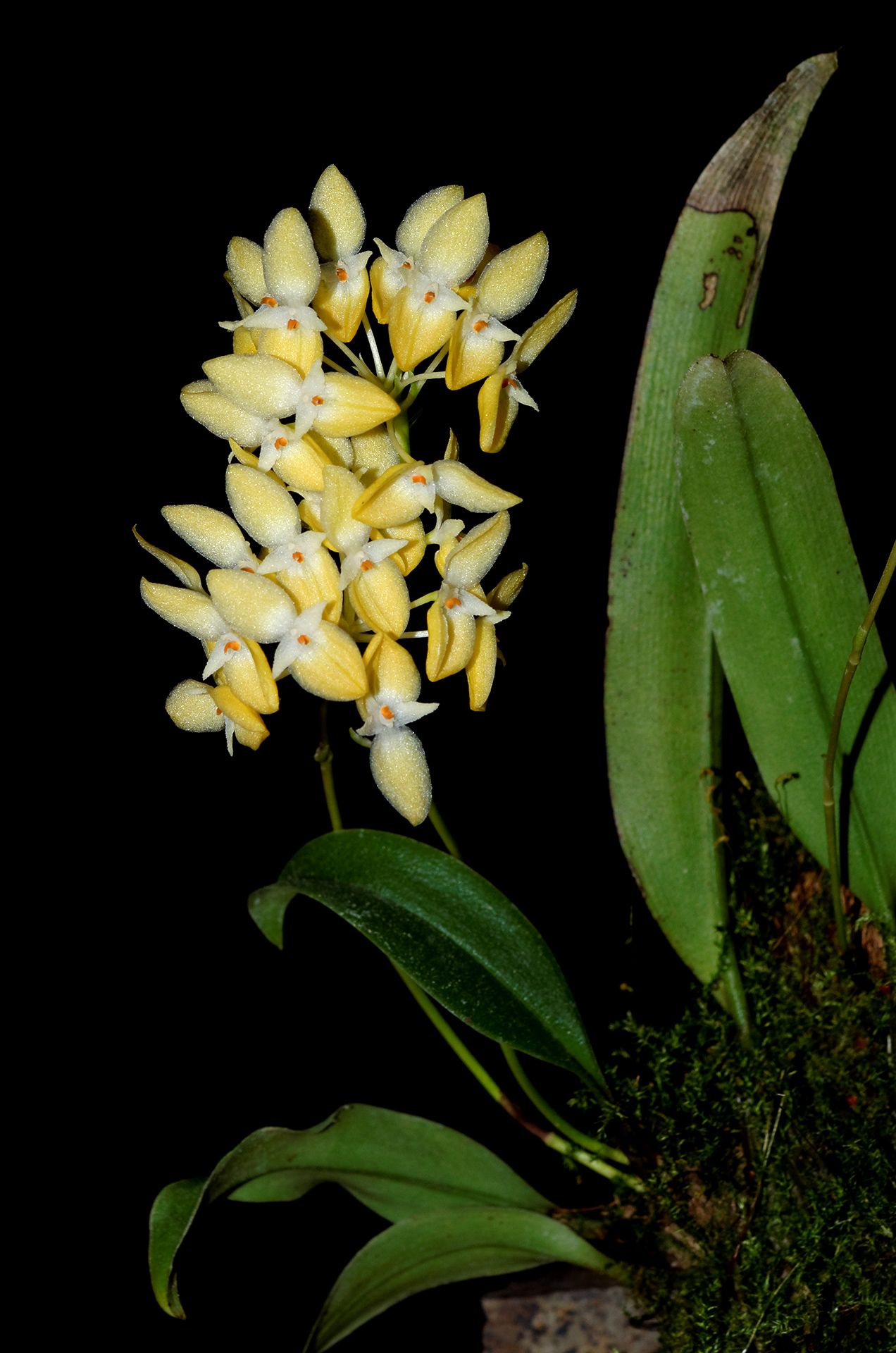 Found in Sumatra without exact locality as a small sized, warm to cool growing epiphyte with clowse set conic-ovoid pseudobulbs carrying a single, apical, erect, coriaceous, fleshy, oblong-ellipitc, obtuse, attenuate below into the sessile base leaf that blooms in the late fall on an erect, 2.4 to 3.2" [6 to 8 cm] long including the 1.8" [4.5 cm] long peduncle, several [9] flowered inflorescence with the flowers held in an apical corymb and has large, linear-lanceolate, acuminate floral bracts