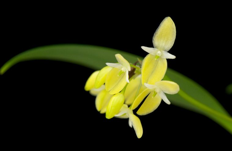 Found in the Philippines on Mt Halcon on mossy tree trunks at elevations around 1500 meters as a mini-miniature sized, cool growing epiphyte with chain-like, depressed pseudobulbs carrying a single, apical, erect, oblanceolate to spathulate leaf that blooms in the fall on a brownish yellow, slender, .6" [1.5 cm] long, successively few, several flowered inflorescence.