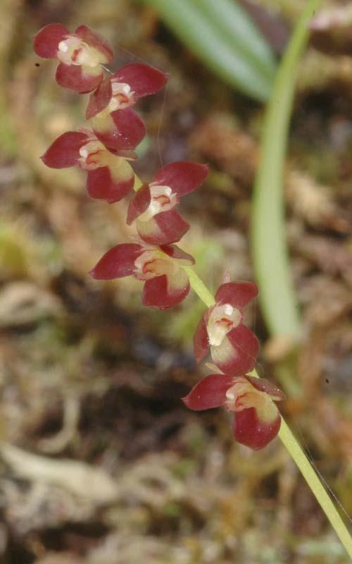 Found in Madagascar in woods with lichens at elevations around 1000 to 1600 meters as a mini-miniature sized, cool growing epiphyte with sub-globose closely set pseudobulbs carrying a single, apical, oblanceolate to oblanceolate linear, acute to apiculate apically and attenuate petiolate basally leaf that blooms in the early summer on a 1" [2.5 cm] long, very thin, 2 to 3 flowered inflorescence enveloped by 1 to 2 small sheaths and having oval-apiculate bracts that enveloping 1/2 the length of the pedicel.