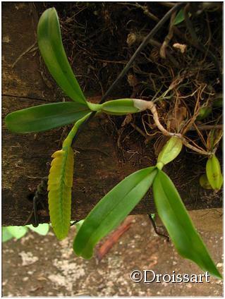 Found in Nigeria, Cameroon, Congo and Equatorial Guinea in rain and semi deciduous forests as a small sized epiphyte with 1.4 to 2.8" [3.5 to 7 cm] between each, ellipsoid, slightly compressed, sharply 4 to 5 angled pseudobulb carrying two, apical, erect, coriaceous, lanceolate to linear-lanceolate, obtuse, gradually narrowing below into the petiolate base leaf that blooms in the fall on a basal, erect to patent, terete, glabrous, 3 to 4.8" " [7.5 to 22 cm] long, slightly swollen, flattened, 18 to 50 flowered inflorescence that is 4 angled in coss-section and has concave sides from which the disitchous flowers arise