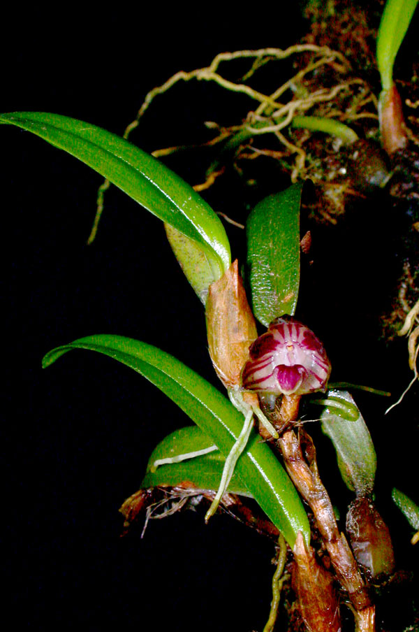 Found in New Guinea at elevations around 800 to 2500 meters as a medium sized, hot to cool growing epiphyte with a pendent rhizome giving rise to, 2.4" [6 cm] between each cylindrical-ovoid pseudobulb carrying a single, apical, erect, linear-ligulate, obtuse, minutely apiculate, glabrous leaf that blooms in the spring, summer and early fall on a .2" [4 mm] long, single flowered inflorescence with tubular, acute to apiculate, shorter than the ovary floral bracts.