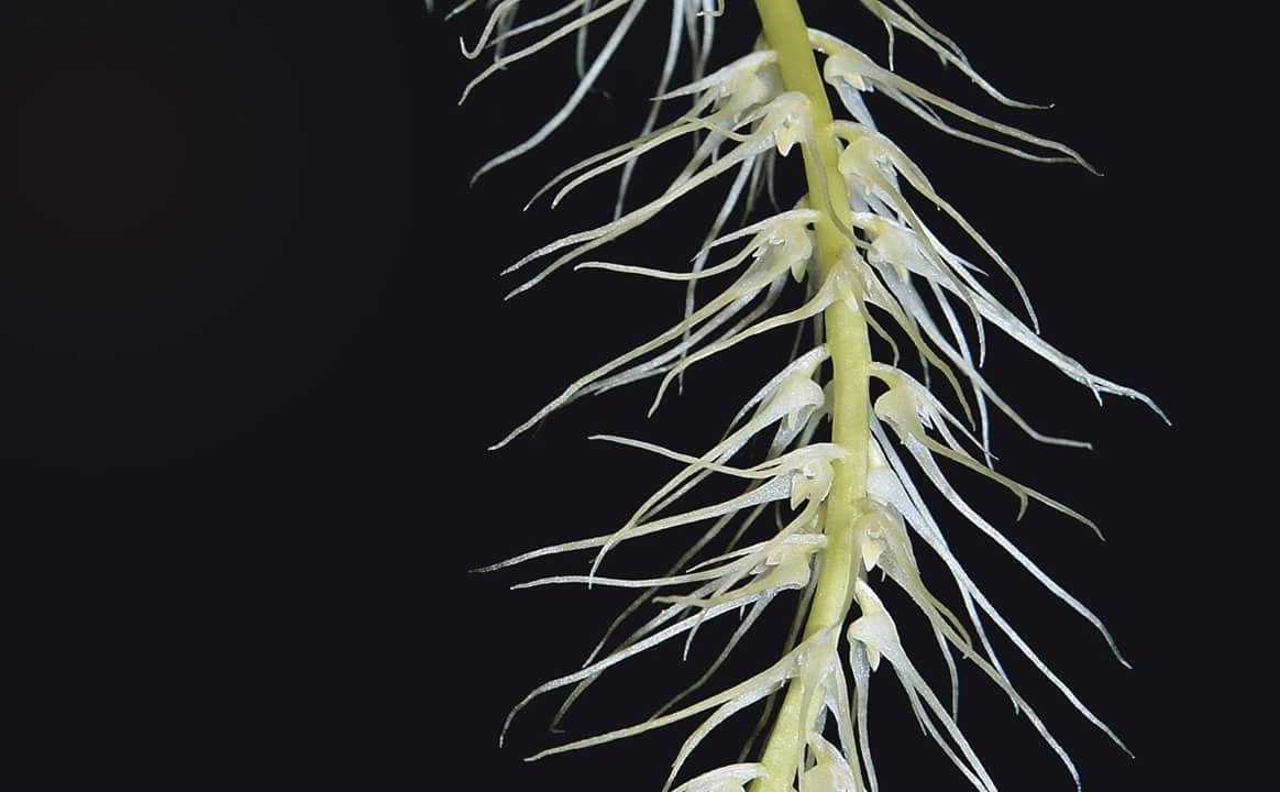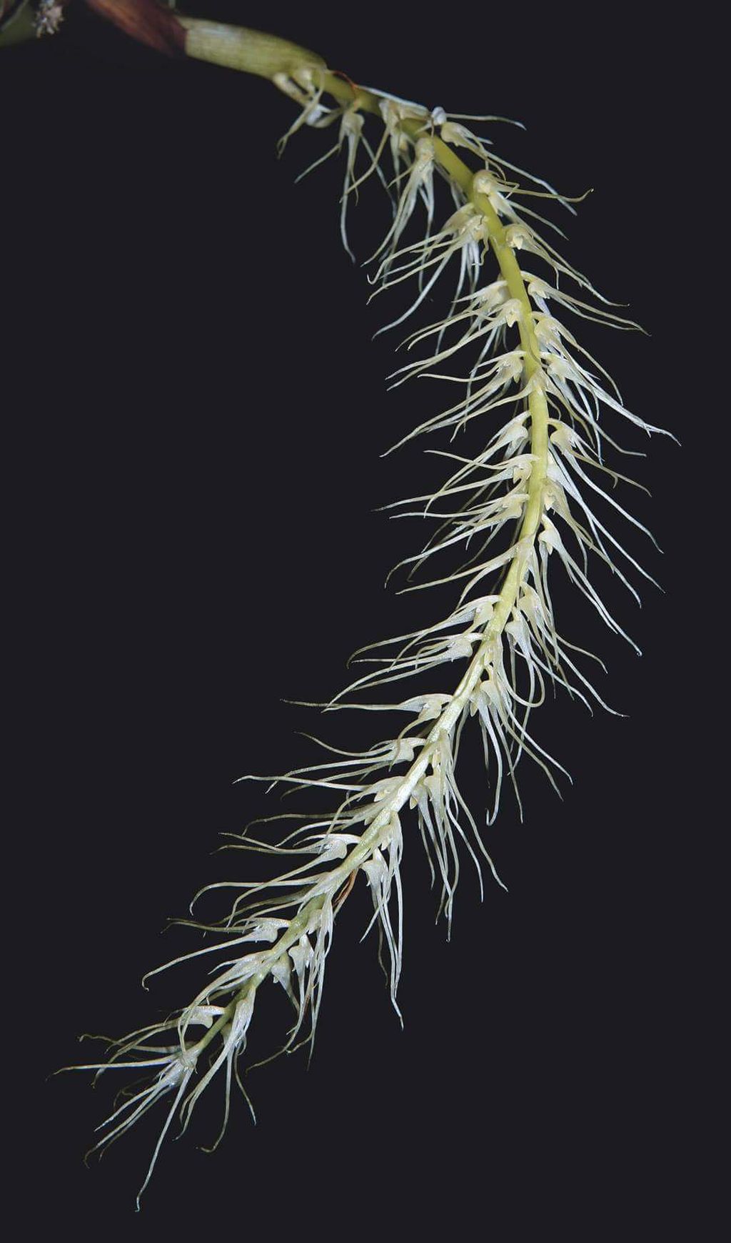 Found in western Java, western Sumatra and Borneo at elevations around 1400 meters as a small sized, cool growing, creeping and branching epiphyte with 3 to 6" [7.5 to 15 cm] between each small, disc-shaped pseudobulb carrying a single, lanceolate, narrowing apically, obtuse, cuneate below into the petiolate base leaf that blooms on an erect, basal, arching, pale yellowish green with brown spotting, peduncle 1.8 to 2.4" [4.5 to 6 cm] long, rachis angular, pale green to 5 to 7.6" [12.5 to 19 cm] long, 6.8 to 10" [17 to 25 cm] long overall, densely many flowered inflorescence.