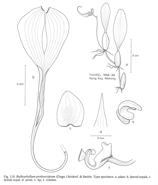 References W3 Tropicos, Kew Monocot list , IPNI ; The Orchids of Thailand Seidenfaden & Smitinand 1961; Botanisk Tidsskrift Bind 66 Hefte 4 Contributions to the Orchid Flora of Thailand III Seidenfaden 1971 drawing fide; Notes on Cirrhopetalum Seidenfaden 1973 Drawing fide; Dansk Botanisk Arkiv Bind 33 #3 Orchid Genera in Thailand VIII Bulbophyllum Thou Seidenfaden 1979 drawing fide; Bulbophyllum and Their Allies Seigerist 2001 as Mastigion proboscidium; Bulbophyllum: the incomplete Guide From A to why? Bill Thoms 2009 drawing fide; Orchids of Northeast India Vol 1 2016 Bulbophyllum_proboscideum-a new record to India A N Rao