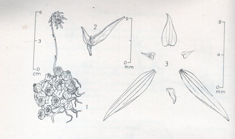 Found in southern India at elevations around 1200 to 1300 meters as a cool growing epiphyte with close set, wrinkled, broadly ovoid pseudobulbs carrying two apical erect, deciduous leaves that blooms after leaffall on an erect, racemose, filiform, decurved to 18" [45 cm] long, 6 to 10 flowered inflorescence with lanceolate, much shorter than the ovary floral bracts.