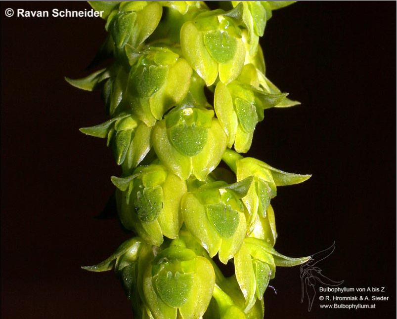 Found in the Philippines at elevations around 1400 meters as a mini-miniature sized, cool growing epiphyte with close set, ovoid to barrel shaped, dark green often suffused or striated with purplish brown pseudobulb carrying a single, apical, flat to arching, very thick, heavy, elliptic to oblong-elliptic, obtusovatee, petiolate base leaf that blooms on an erect, basal, dull greenish brown, peduncle to 9.6" [24 cm] long, rachis to 1.68" [4.3 cm] long, densely many flowered inflorescence carrying flowers with a faint unpleasant odor.